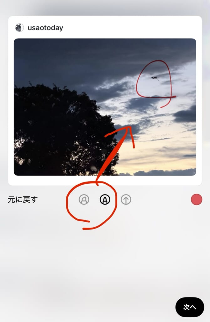 写真下部にペンが表示されますので、タップして選択すると、写真に落書きが可能になります。(今回は鳥をまるで囲ってみました)