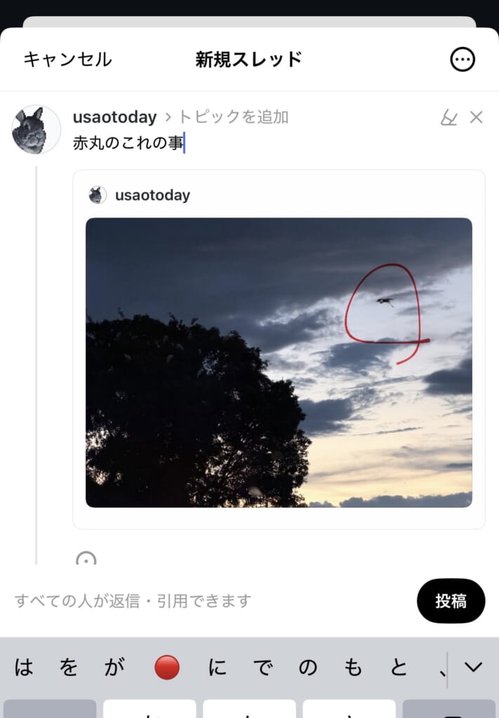 そして、文字を入力後投稿すると、赤マーカーでマークアップされた画像が引用投稿されます。
